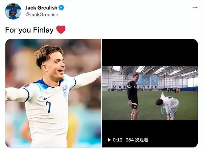 故事的主人公是一位名叫芬利的11岁曼城小球迷,不幸的是,出生时的他就患有脑瘫无法像正常人那般生活,但足球却成为了他的精神依靠。他曾经给自己的偶像格拉利什写过信,而格拉利什除了赠送球衣外,还曾在一次关怀活动中亲临现场与芬利进行了互动。他们互相握手、拥抱、聊天,甚至达成了一个承诺——倘若能够在不久后揭幕的世界杯上取得进球,格拉利什会如芬利所愿,在广大观众面前做出类似“毛毛虫”的庆祝动作。众所周知,格拉利什自己的妹妹霍莉也患有同样的疾病,这也令他更能够与该类患者的内心世界产生共鸣。在世界杯上进球后,格拉利什第一时间通过个人社媒发布了照片和动态,并写上了“For you Finlay(献给你,芬利)”,这份暖心善举,无疑值得被称颂。
