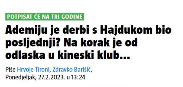 克罗地亚记者安特-苏契奇表示,在为萨格勒布迪纳摩效力近12年半之后,北京国安将会成为阿代米的下一站。这笔交易的转会费为100万欧元,阿代米将会和国安签约三年,而3月19日对阵里耶卡的比赛也会是他萨格勒布迪纳摩生涯的最后一场比赛。
