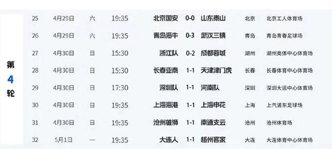 第4轮北京国安0-0战平山东泰山、青岛海牛0-3武汉三镇、长春亚泰1-1天津津门虎,浙江0-2成都蓉城,深圳队1-1战平河南队、上海海港1-1申花、沧州雄狮1-1南通支云、大连人1-1战平梅州客家。可见,本轮8支主场球队难求一胜,其中青岛海牛、浙江队遭遇了完败,其他6支主场球队都被客队逼平。争冠球队和保级球队差距缩小。